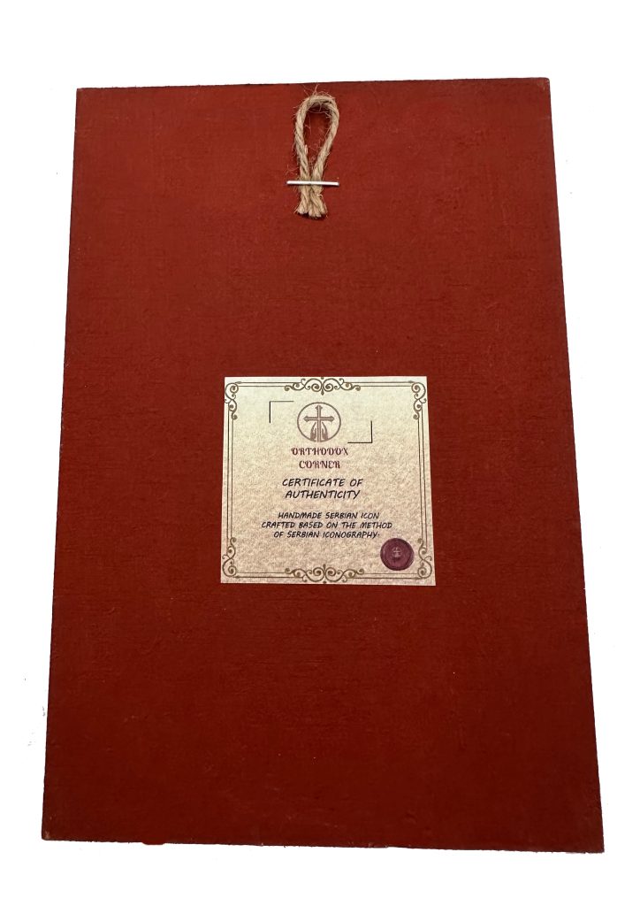Each icon is securely packaged to arrive in perfect condition, ready to be cherished for generations. The back carries our workshop mark and proof of handmade craftsmanship, while the side reveals the natural beauty of the wood and protective finish. Every icon comes with a certificate confirming its quality, origin, and creation in accordance with Orthodox tradition — a timeless gift for your home or a loved one.
